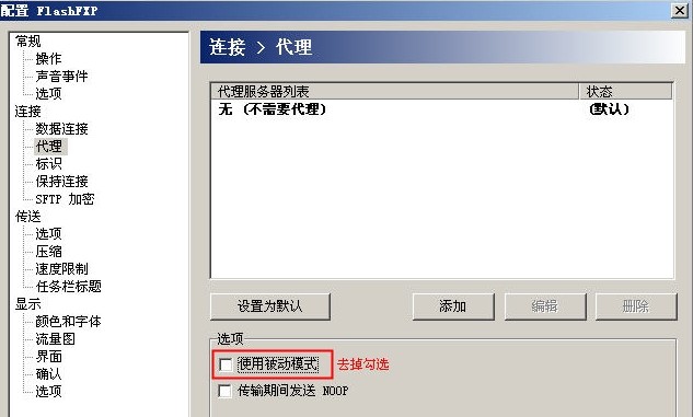 打开本地FlashFXP,点上面“选项”,打开“参数设置”选项,在代理设置那里取消使用被动模式以后完全恢复正常。